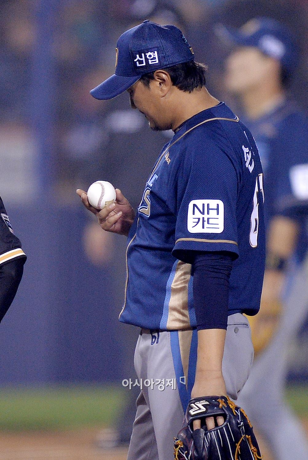 [잠실=아시아경제 김현민 기자] 프로야구 2015 포스트시즌 NC 다이노스와 두산 베어스의 플레이오프 3차전이 21일 잠실구장에서 열렸다. NC 선발투수 손민한이 검지손가락 부상으로 교체되고 있다. 김현민 기자 kimhyun81@asiae.co.kr<ⓒ세계를 보는 창 경제를 보는 눈, 아시아경제(www.asiae.co.kr) 무단전재 배포금지>