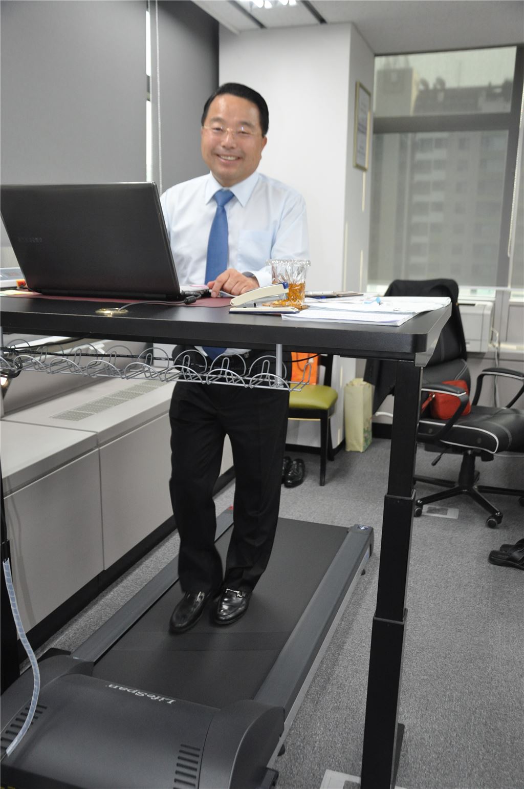 이형수 건영 회장은 부족한 운동량을 채우고, 체중을 관리하기 위해 틈틈이 런닝머신 위에서 일을 본다.