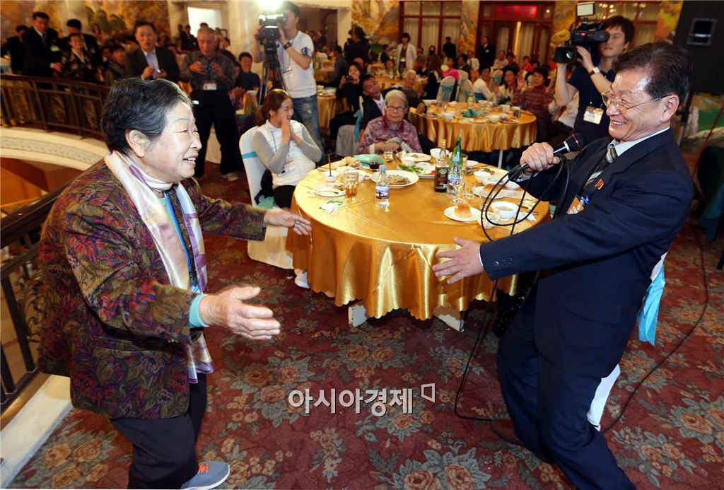 [금강산=사진공동취재단] 25일 강원 고성 금강산에서 열린 제20차 남북이산가족상봉 2차 중식상봉 행사에서 남중랑 할머니가 북측의 조카 남순철 씨와 함께 '고향의 봄'을 부르며 춤을 추고 있다. 최우창 기자 smicer@asiae.co.kr<ⓒ세계를 보는 창 경제를 보는 눈, 아시아경제(www.asiae.co.kr) 무단전재 배포금지>