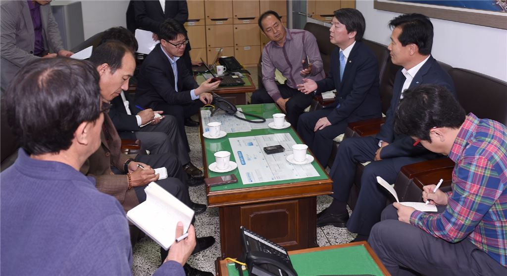 [안철수 전 새정연 공동대표가 26일 여수시청 브리핑룸에서 기자간담회을 열고 있다.]