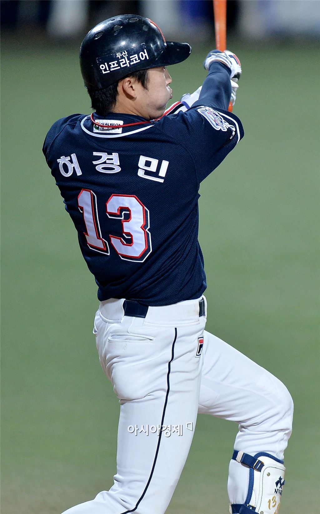 [대구=아시아경제 김현민 기자] 프로야구 2015 포스트시즌 두산 베어스와 삼성 라이온즈의 한국시리즈 1차전이 26일 대구구장에서 열렸다. 1회초 1사에서 두산 허경민이 삼성 선발 피가로를 상대로 선제 솔로 홈런을 치고 있다. 김현민 기자 kimhyun81@asiae.co.kr<ⓒ세계를 보는 창 경제를 보는 눈, 아시아경제(www.asiae.co.kr) 무단전재 배포금지>