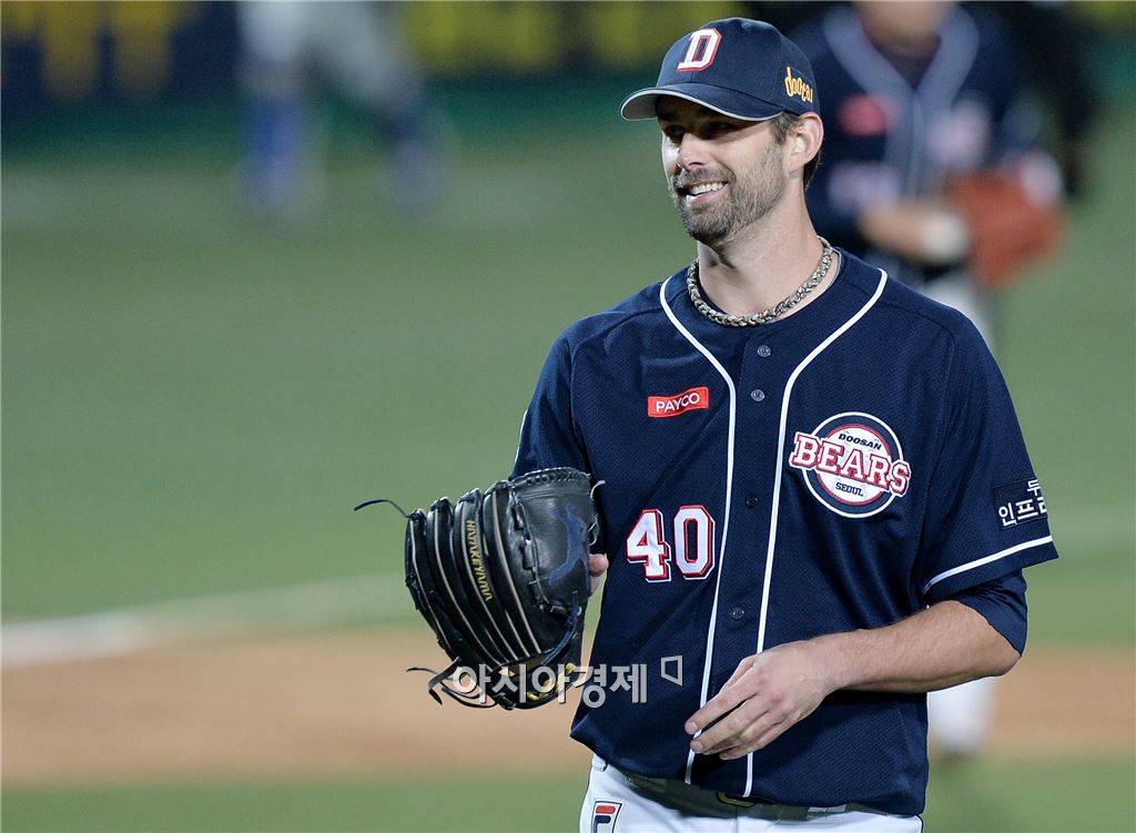 [대구=아시아경제 김현민 기자] 프로야구 2015 포스트시즌 두산 베어스와 삼성 라이온즈의 한국시리즈 2차전이 27일 대구구장에서 열렸다. 두산 선발 니퍼트가 1회말 수비를 무실점으로 막고 양의지 포수를 향해 미소짓고 있다. 김현민 기자 kimhyun81@asiae.co.kr<ⓒ세계를 보는 창 경제를 보는 눈, 아시아경제(www.asiae.co.kr) 무단전재 배포금지>