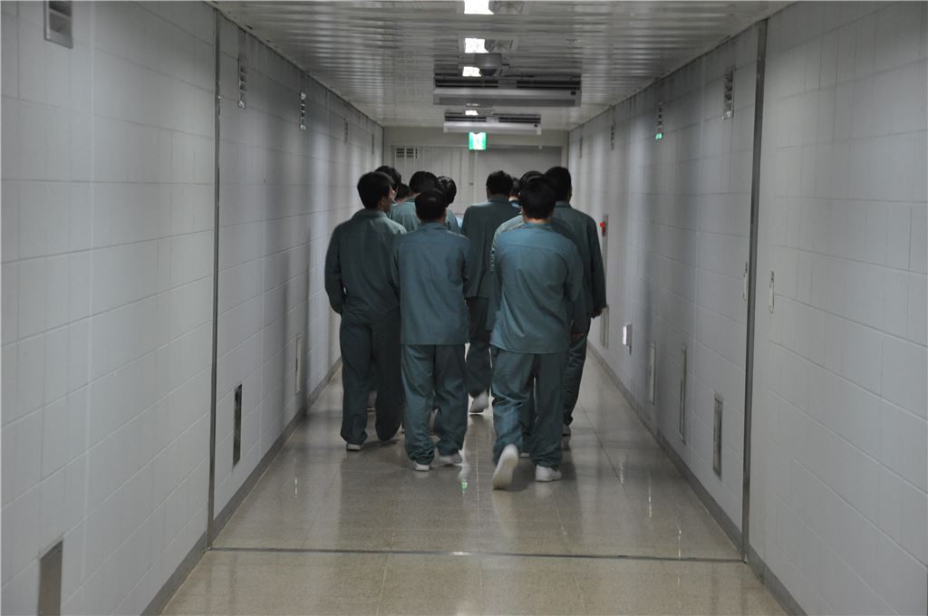 ▲26일 법무부에서 주재한 '1일 수용자체험'을 하기 위해 온 기자들이 남부교도소 접견실을 가기 위해 이동하고 있다.