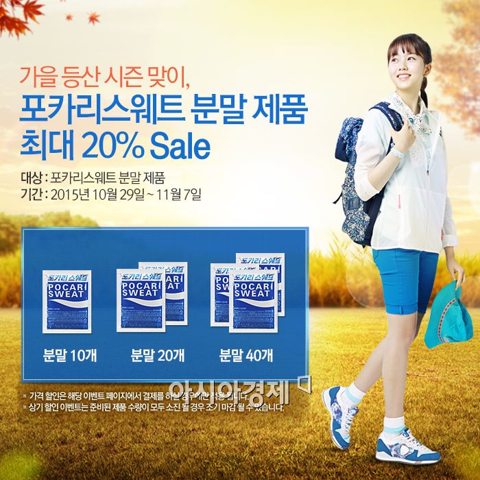 [아시아경제 이광호 기자]동아오츠카는 가을 단풍놀이 시즌을 맞아 포카리스웨트 분말 할인행사를 진행한다고 28일 전했다.포카리스웨트 분말은 물 1ℓ와 섞어 빠르고 간편하게 이온음료를 마실 수 있도록 한 제품이다. 휴대와 보관에 용이해 등산이나 캠핑을 준비할 때 챙겨야 할 필수아이템으로 인기를 끌고 있다. 이번 행사는 29일부터 다음달 7일까지 열흘간 진행되며, 포카리스웨트 분말 10입 패키지 10%, 20∼40입 패키지 20% 할인된 가격으로 구입할 수 있다.동아오츠카 관계자는 "등산·캠핑 등 다량의 땀이 배출되는 상황에서 적당한 이온섭취는 체내 기능을 안정화 시키는데 도움을 준다"며 "아웃도어 필수 아이템인 포카리 분말을 가격까지 가볍게 만나보길 바란다"고 말했다. 이광호 기자 kwang@asiae.co.kr<ⓒ세계를 보는 창 경제를 보는 눈, 아시아경제(www.asiae.co.kr) 무단전재 배포금지>
