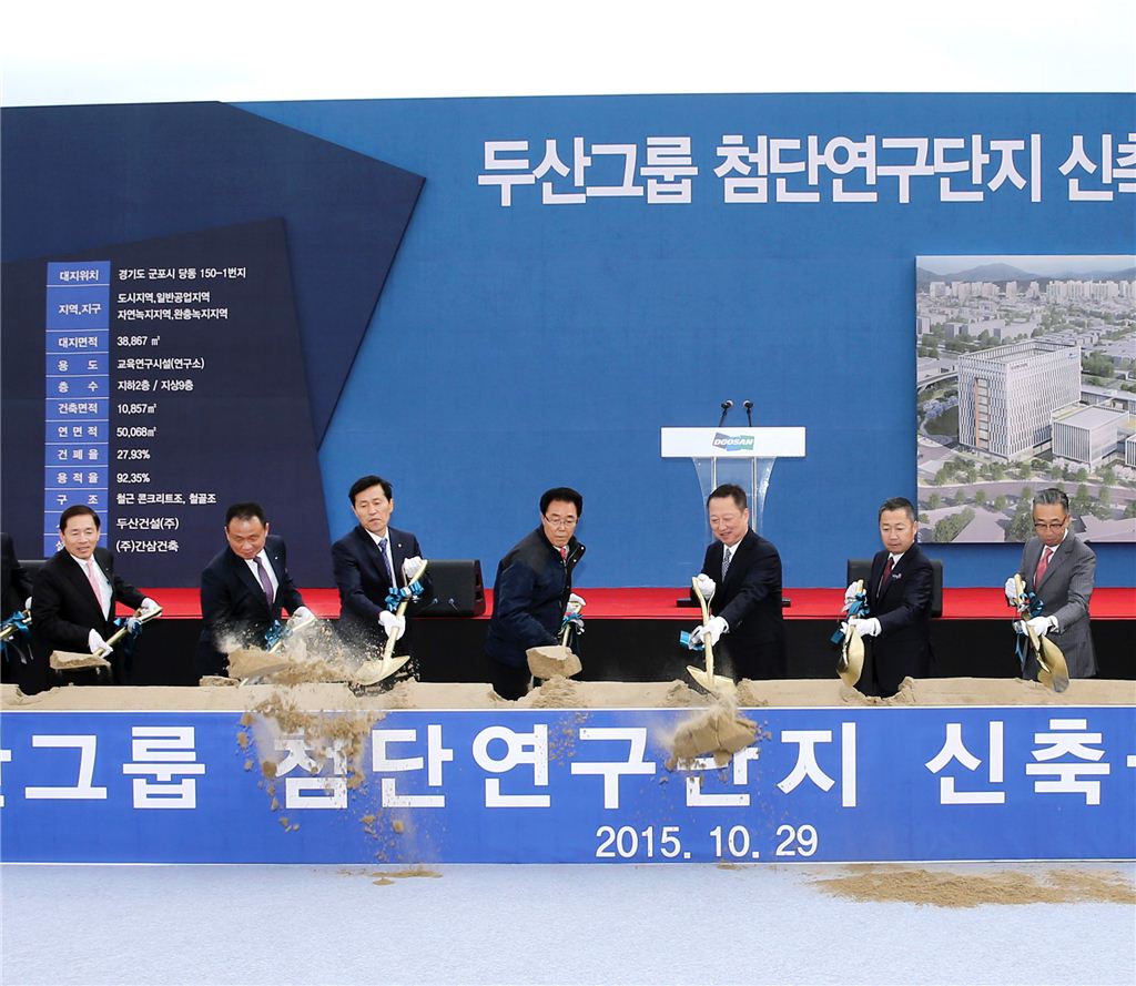 ▲두산그룹 첨단연구단지 신축공사 기공식에서 참석 인사들이 시삽을 하고 있다. 왼쪽부터 이병화 두산건설 사장, 손동연 두산인프라코어 사장, 이학영 국회의원, 김윤주 군포시장, 박용만 두산그룹 회장, 박정원 ㈜두산 회장, 박지원 두산중공업 부회장. <br />