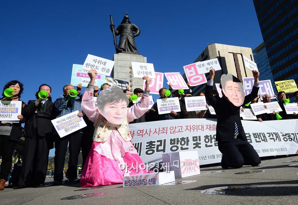 [아시아경제 백소아 기자] 한·일 정상회담을 사흘 앞둔 30일 서울 광화문광장에서 열린 아베 일본 총리 방한 반대 기자회견에서 한·일정상회담을 반대하는 퍼포먼스를 진행하고 있다. 기자회견 참가자들은 침략 역사 사죄 않고 자위대 재출병 추진하는 아베 총리의 방한과 한·일정상회담을 반대했다.백소아 기자 sharp2046@asiae.co.kr<ⓒ세계를 보는 창 경제를 보는 눈, 아시아경제(www.asiae.co.kr) 무단전재 배포금지>