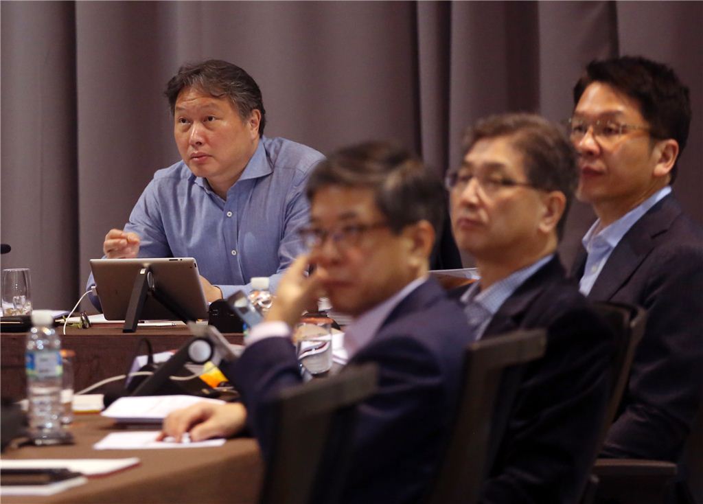 ▲최태원 SK 회장이 지난 28일부터 2박3일 동안 제주에서 열린 'CEO 세미나'에서 발표자료를 바라보고 있다.