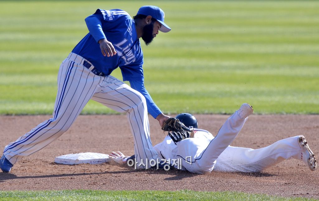[잠실=아시아경제 김현민 기자] 프로야구 2015 포스트시즌 삼성 라이온즈와 두산 베어스의 한국시리즈 5차전이 31일 잠실구장에서 열렸다. 2회말 무사 1루에서 두산 고영민 타석 때 도루를 시도한 1루주자 오재원이 삼성 2루수 나바로에 태그아웃되고 있다. 김현민 기자 kimhyun81@asiae.co.kr<ⓒ세계를 보는 창 경제를 보는 눈, 아시아경제(www.asiae.co.kr) 무단전재 배포금지>