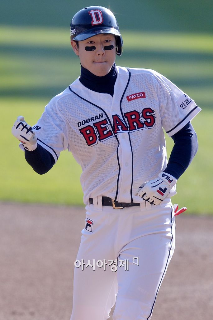 [잠실=아시아경제 김현민 기자] 프로야구 2015 포스트시즌 삼성 라이온즈와 두산 베어스의 한국시리즈 5차전이 31일 잠실구장에서 열렸다. 3회말 2사 1,3루에서 두산 박건우가 추가 1타점 적시타를 치고 환호하고 있다. 김현민 기자 kimhyun81@asiae.co.kr<ⓒ세계를 보는 창 경제를 보는 눈, 아시아경제(www.asiae.co.kr) 무단전재 배포금지>