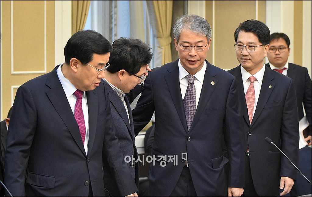 [아시아경제 윤동주 기자] 임종룡 금융위원장과 진웅섭 금감원장이 2일 국회에서 열린 카드 수수료 인하 당정협의에 참석, 김정훈 새누리당 정책위의장 등 참석의원들과 포즈를 취하고 있다.윤동주 기자 doso7@asiae.co.kr<ⓒ세계를 보는 창 경제를 보는 눈, 아시아경제(www.asiae.co.kr) 무단전재 배포금지>