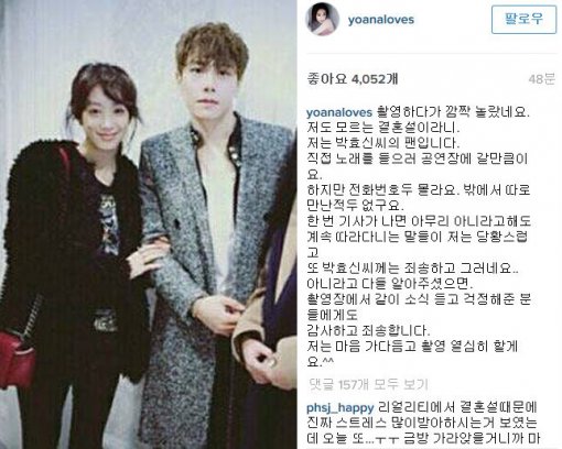 [아시아경제 온라인이슈팀] 배우 정려원이 가수 박효신과 열애설이 불거진 가운데 정려원 측이 적극적으로 해명했다.1일 한 매체에 따르면 웨딩업계 한 관계자가 "정려원과 박효신이 결혼을 전제로 진지한 교제를 하고 있다"며 "현재 식장과 웨딩드레스 등을 고르기 위해서 웨딩플래너들과 극비리에 접촉 중에 있다"라고 보도했다.보도에 따르면, 정려원은 지난해 12월 박효신의 'Happy Together' 콘서트장과 올해 5월에 박효신이 주연으로 나선 뮤지컬 '팬텀' 공연장을 찾아 팬들에게 목격되기도 했다.그러나 열애설이 불거지자 정려원은 자신의 인스타그램에 박효신과 찍은 사진과 함께 "밖에서 따로 만난 적도 없고 팬으로써 좋아한 것 뿐인데 열애설이 나 황당하다"라는 글을 게재했다.이어 "박효신씨께 죄송하고 촬영장에서 같이 걱정해준 분들께 감사하다"고 열애설을 일축했다.한편 정려원의 소속사 관계자 역시 2일 오후 한 매체에 "본인에게 직접 확인한 결과 박효신과 밥 한 번 먹은 적도 없다더라"며 "현재 박효신과의 열애설은 물론 갑작스런 결혼설이 무척이나 당황스럽다"는 입장을 밝혔다.온라인이슈팀 issue@asiae.co.kr<ⓒ세계를 보는 창 경제를 보는 눈, 아시아경제(www.asiae.co.kr) 무단전재 배포금지>