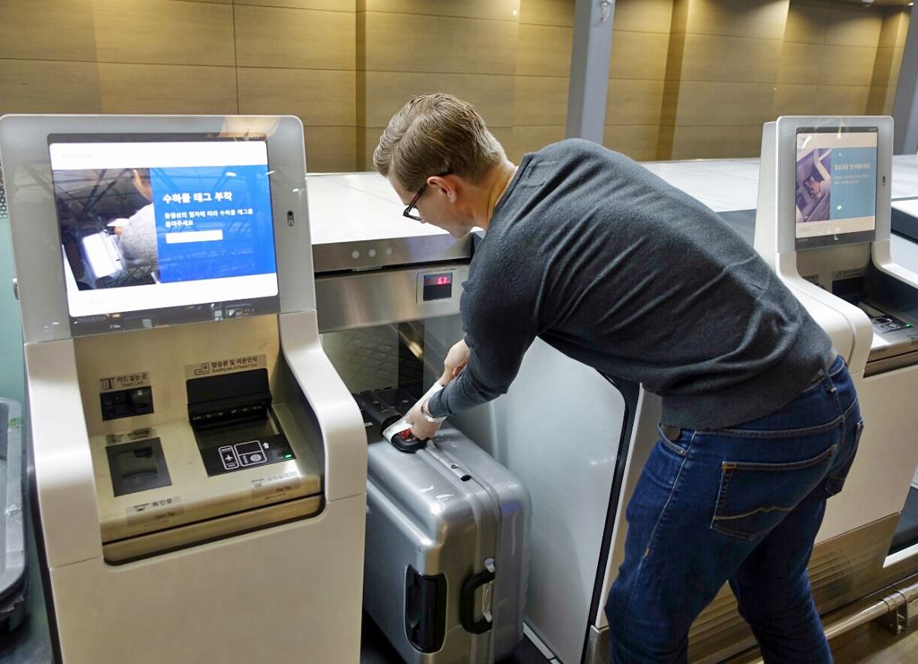 SK텔레콤은 인천국제공항공사와 함께 인천공항 자동탑승수속 전용구역을 구축하고 3일부터 서비스를 제공한다고 밝혔다. 사진은 인천공항을 찾은 고객이 자동수하물위탁서비스를 이용해 항공사 직원을 통하지 않고 직접 좌석 배정과 탑승권 발권, 수하물 위탁 등을 스스로 하고 있는 모습.(사진=SKT)