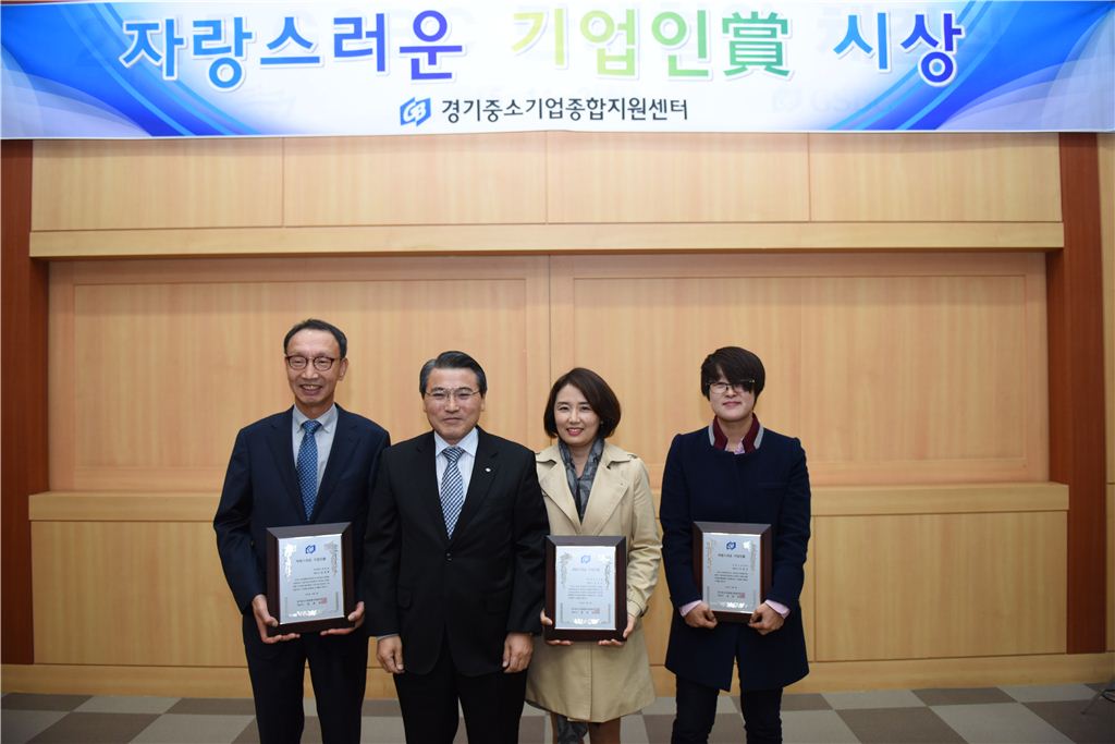 경기중소기업종합지원센터는 3일 자랑스러운 기업인상 시상식을 가졌다. 윤종일 경기중기센터 대표(왼쪽 두번째)와 수상기업인들이 기념촬영을 하고 있다.
