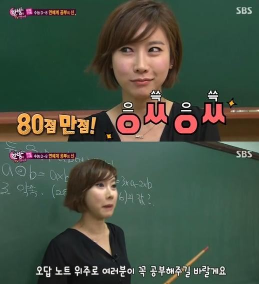 [아시아경제 온라인이슈팀] '수학의 신'으로 불리는 방송인 곽현화가 공부 비법을 공개했다. 4일 SBS '한밤의 TV 연예'는 수능을 앞두고 연예계 '공부의 신'들을 찾아가 인터뷰를 진행하는 방송을 내보냈다.이날 이화여대 수학과 출신인 곽현화는 "학창시절 수학성적은 80점 만점에 80점이었다"고 밝혔다.이어 "부족한 단원을 집중 탐구해서 오답노트 위주로 공부하기 바란다"며 "수학의 낯선 기호들을 외국어처럼 내 혀에 체화시키듯 매일 30분씩 공부하는 게 포인트다"고 귀띔했다. 곽현화는 또 '한밤' 제작진이 제시한 문제를 거침없이 풀어내 눈길을 끌었다.온라인이슈팀 issue@asiae.co.kr<ⓒ세계를 보는 창 경제를 보는 눈, 아시아경제(www.asiae.co.kr) 무단전재 배포금지>