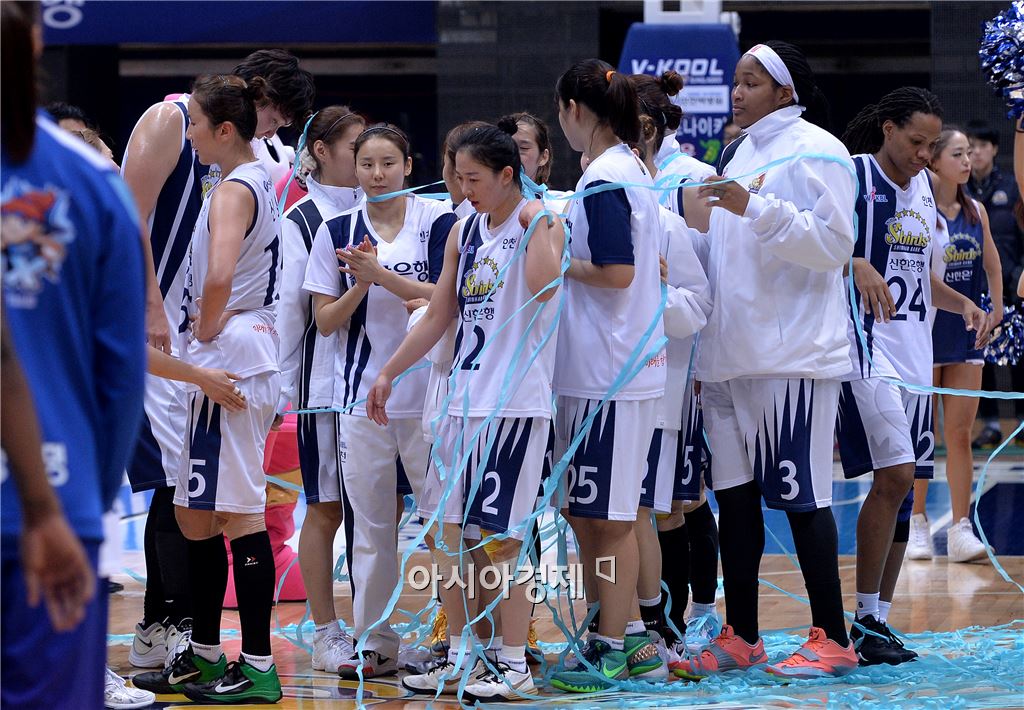 [인천=아시아경제 김현민 기자] '2015-2016 KDB생명 여자프로농구' 신한은행과 삼성생명의 경기가 6일 인천 도원체육관에서 열렸다. 66-54로 승리를 거둔 신한은행 선수들이 자축하고 있다. 김현민 기자 kimhyun81@asiae.co.kr<ⓒ세계를 보는 창 경제를 보는 눈, 아시아경제(www.asiae.co.kr) 무단전재 배포금지>