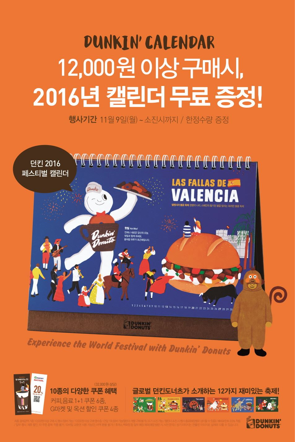 [아시아경제 최서연 기자] 던킨도너츠가 9일부터 던킨도너츠 제품 1만2000원 이상 구매 시 ‘2016 페스티벌 캘린더’를 증정하는 프로모션을 진행한다. 이번에 선보이는 2016 페스티벌 캘린더는 던킨도너츠를 만나볼 수 있는 세계 곳곳의 나라의 페스티벌을 소개하는 콘셉트로 제작됐다. 나라별 특성을 살려낸 컬러풀하고 특색 있는 그림과 함께 각 페스티벌에 어울리는 던킨도너츠 제품을 추천하고 있다. 또한, 매월 캘린더 이미지에서 숨은 그림 찾기처럼 던킨도너츠 캐릭터 ‘던키’를 찾아보는 재미도 느낄 수 있다. 또한 캘린더에는 3만2000원 상당의 다양한 할인 혜택을 즐길 수 있는 쿠폰 10종이 동봉돼 있다. 쿠폰은 핫아메리카노(S) 1+1, 아이스 아메리카노(S) 1+1, 쿨라타(S) 1+1 등 던킨도너츠 쿠폰 6종과 G마켓 및 옥션할인쿠폰 4종으로 구성돼 있다. 각 쿠폰은 유효기간 내에 사용 가능하다. 이번 프로모션은 최종 결제금액 기준 1만2000원 이상 구매 영수증 1매당 캘린더 1개를 무료로 증정한다. 행사 참여 시, 해피포인트는 0.5% 적립 가능하며, 일부 행사 및 제휴할인, 타 쿠폰 사용이 불가하다. 행사 진행 기간은 9일부터 소진 시까지다.최서연 기자 christine89@asiae.co.kr<ⓒ세계를 보는 창 경제를 보는 눈, 아시아경제(www.asiae.co.kr) 무단전재 배포금지>