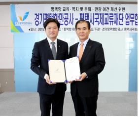 경기평택항만공사와 평택시국제교류재단은 9일 업무협약을 체결했다. 최광일 평택항만공사 사장(오른쪽)과 서정희 평택국제교류재단 사무처장이 협약체결 후 기념촬영을 하고 있다.