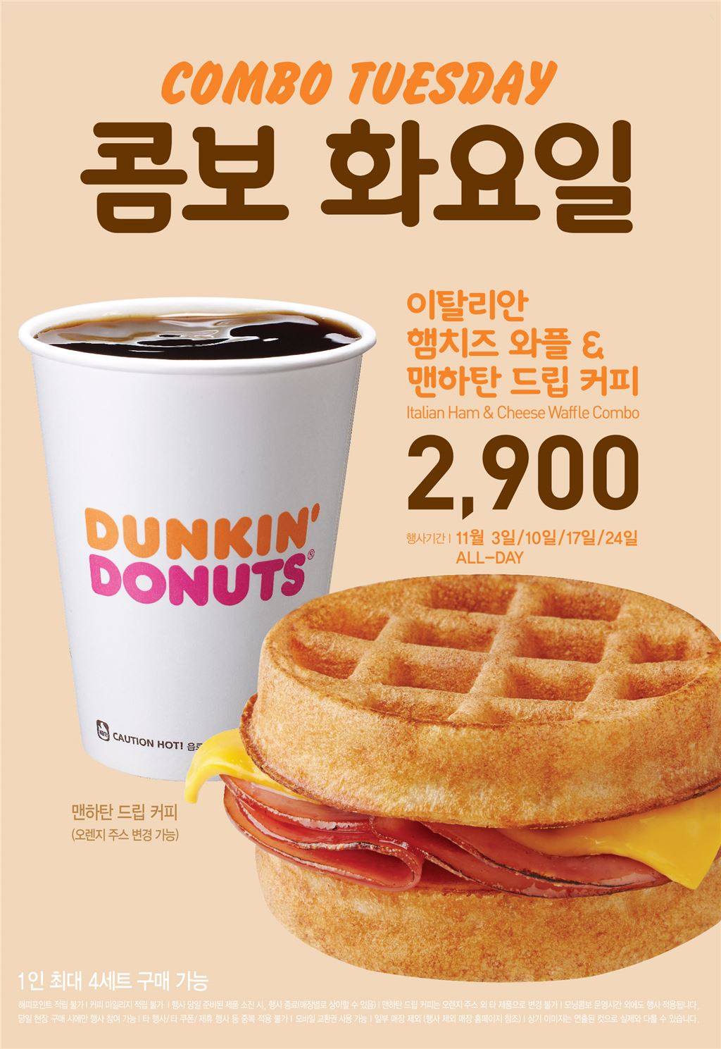 [아시아경제 최서연 기자] 던킨도너츠가 11월 한 달간 매주 화요일과 수요일에 각각 ‘이탈리안 햄치즈 와플 콤보’와 ‘기프트 팩’을 특별한 가격으로 만나볼 수 있는 ‘콤보 화요일’, ‘해피 수요일’ 프로모션을 진행한다고 10일 밝혔다.11월 매주 화요일(10일, 17일, 24일)마다 진행되는 콤보 화요일 프로모션은 이탈리안 햄치즈 와플과 맨하탄 드립 커피로 구성된 ‘이탈리안 햄치즈 와플 콤보’를 하루 종일 2900원에 만나볼 수 있는 행사다. 이탈리아의 고급 햄인 ‘모타델라’와 향긋한 메이플 와플이 어우러진 ‘이탈리안 햄치즈 와플’은 바쁜 아침 식사대용으로 담백하고 든든하게 즐길 수 있는 제품이다. 세트에 포함된 맨하탄 드립 커피는 오렌지 주스로 변경이 가능하다.11월 매주 수요일(11일, 18일, 25일)에는 해피 수요일 프로모션이 진행된다. 해피 수요일 프로모션은 ‘초코 우유 글레이즈드’ 3개와 ‘던킨 글레이즈드’ 3개로 구성된 기프트 팩을 기존 가격보다 2400원 할인된 3900원에 만나볼 수 있는 행사다. 콤보 화요일과 해피 수요일 프로모션은 모두 1인당 최대 4세트까지 구매할 수 있으며 제품 구성은 변경할 수 없다. 행사 참여 시 해피포인트 적립, 제휴 행사 및 타 쿠폰 적용, 일부 행사 중복 참여는 불가하다. 행사는 당일 현장 구매 시에만 참여가 가능하며 당일 한정 수량으로 판매되기 때문에 조기소진 될 수 있다. 최서연 기자 christine89@asiae.co.kr<ⓒ세계를 보는 창 경제를 보는 눈, 아시아경제(www.asiae.co.kr) 무단전재 배포금지>