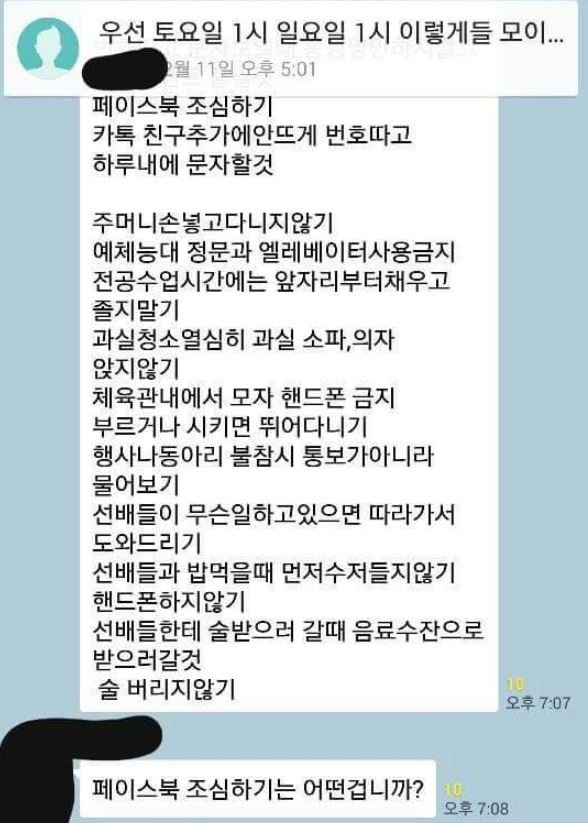 [아시아경제 온라인이슈팀] 수도권의 한 대학에서 또 다시 '똥군기' 논란이 일었다.지난 7일 오후 SNS(소셜네트워크서비스) 페이지에는 '인성이 천한 대학' 이라는 게시물이 게재됐다. 공개된 게시물에는 수도권에 위치한 한 대학의 학부 단체채팅방의 내용이 담겼다. 게시물 사진을 보면 과 대표로 보이는 한 학생이 후배들에게 주의사항을 전달하고 있다. 이 학생은 "페이스북 조심하기, 주머니에 손 넣고 다니지 않기, 부르거나 시키면 뛰어다니기, 선배들과 밥먹을 때 먼저 수저 들지 않기, 선배들한테 술받으러 갈 때 음료수잔으로 받으러 갈 것" 등 학부 생활에서의 주의사항을 강조했다. 이어 "통성명 잘하기, 인사할 때 하던 것 멈추고 차렷자세로 눈쳐다 보지 말고 인사할 것, 문자나 톡할 때 끝에 점찍기, 추리닝 금지" 등 금지사항을 덧붙였다. 해당 게시물을 접한 네티즌들은 "13 미필들이 저러고 있는게 유머"라며 "채팅방을 공개한 사람이 걱정된다"는 반응을 보였다. 또 한 네티즌은 "이런짓하는 자체가 스스로의 얼굴에 똥칠, 먹칠한다는 걸 언제쯤 알까"라고 말했다.사진=SNS 캡처