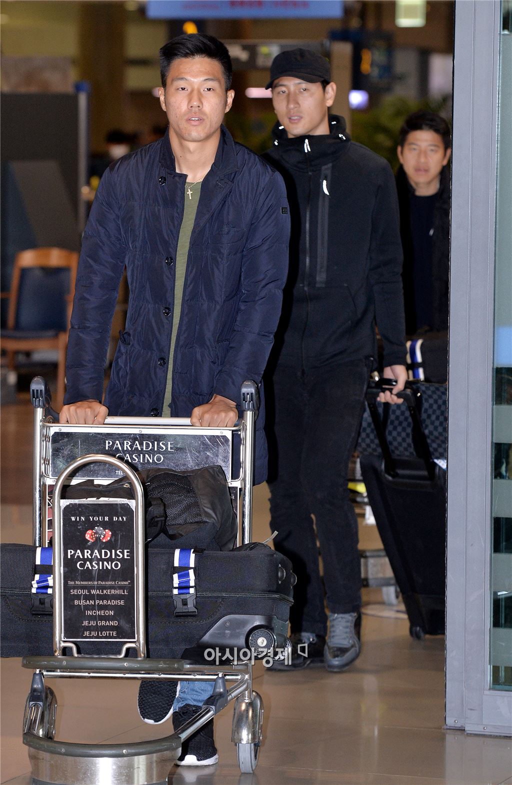 [인천공항=아시아경제 김현민 기자] 축구 국가대표팀 석현준(포르투칼 빅토리아 FC,맨 앞)이 지동원, 박주호와 10일 인천국제공항을 통해 입국하고 있다. 러시아 월드컵 2차예선 G조에서 4전 전승으로 조 선두를 달리고 있는 축구대표팀은 오는 12일 수원월드컵경기장에서 미얀마와 5차전을 벌인 뒤 17일 라오스 비엔티엔에서 라오스전을 치른다. 김현민 기자 kimhyun81@asiae.co.kr<ⓒ세계를 보는 창 경제를 보는 눈, 아시아경제(www.asiae.co.kr) 무단전재 배포금지>