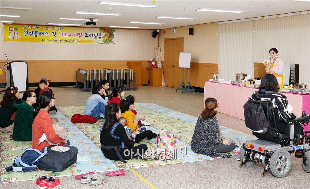 광주 동구는 12일 오전 동구보건소 2층 보건교육실에서 임신 출산 수유부를 대상으로 아토피 예방을 위한 식이요법과 단계별 이유식에 관한 정보를 알려주고, 이유식 조리시연 및 시식을 진행했다.