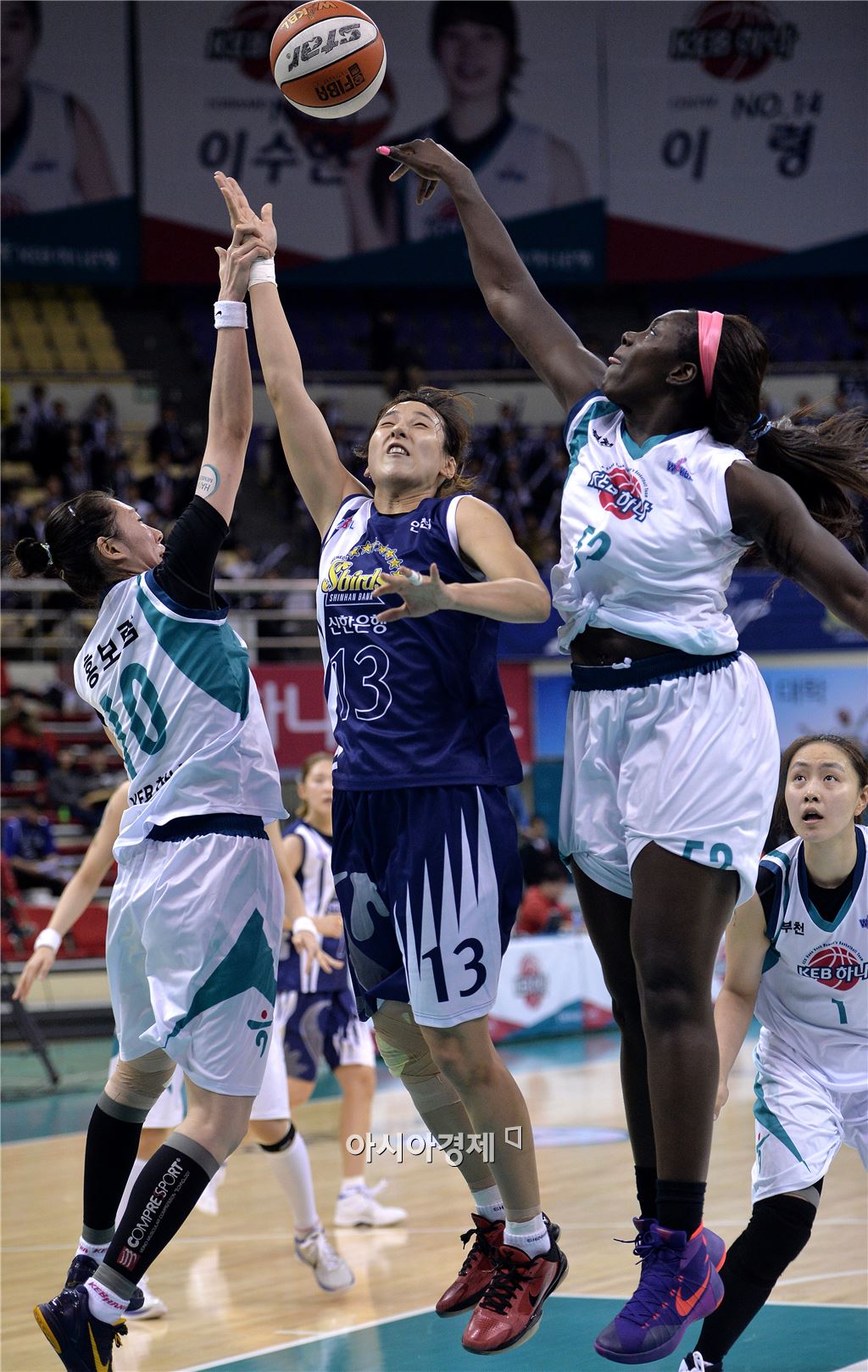 [부천=아시아경제 김현민 기자] '2015-2016 KDB생명 여자프로농구' KEB 하나은행과 신한은행의 경기가 16일 부천체육관에서 열렸다. 신한은행 김단비가 상대 첼시 리의 슛블록에 막히고 있다. 김현민 기자 kimhyun81@asiae.co.kr<ⓒ세계를 보는 창 경제를 보는 눈, 아시아경제(www.asiae.co.kr) 무단전재 배포금지>