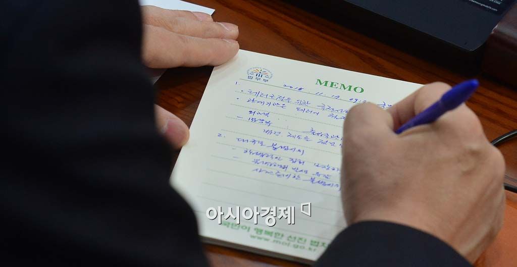 [아시아경제 백소아 기자] 17일 서울 세종로 정부서울청사에서 열린 국무회의에서 김현웅 법무부 장관이 메모지에 대규모 불법집회라고 적고 있다.백소아 기자 sharp2046@asiae.co.kr<ⓒ세계를 보는 창 경제를 보는 눈, 아시아경제(www.asiae.co.kr) 무단전재 배포금지>