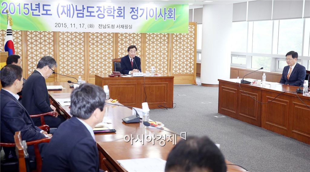 이낙연 전남지사가 17일 오후 도청 서재필실에서 2015년도 (재)남도장학회 정기이사회를 주재하고 있다. 이날 이사회에서는 남도장학회 이사 및 감사 선임안, 2016년도 예산안 등 4개 안건을 심의ㆍ의결했다. 사진제공=전남도