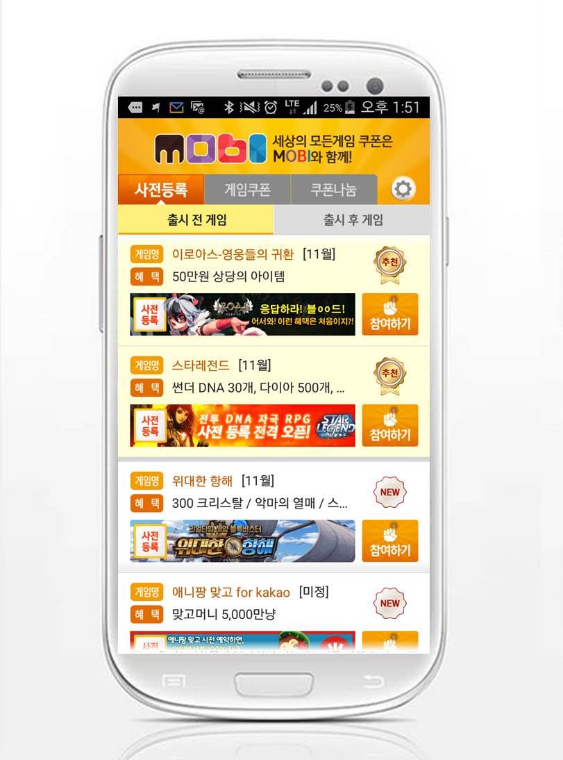 [아시아경제 온라인이슈팀] 모바일 게임 커뮤니티 헝그리앱이 출시한 사전등록 1위 어플리케이션 ‘모비’가 신규 무료 쿠폰을 추가했다. ‘모비’에서 제공하는 무료 게임 쿠폰은 한정 수량으로 파격적인 혜택을 지급하고 있기 때문에 유저들로부터 큰 호응을 얻고 있다.17일 새롭게 추가된 쿠폰은 정식 론칭을 앞두고 사전예약 이벤트를 진행 중인 모바일 RPG ‘이로아스:영웅들의 귀환(이하 이로아스)’ 사전 등록 쿠폰으로 쿠폰을 등록하면 평소에는 받을 수 없는 파격적인 게임 아이템과 캐시를 지급한다.투빗의 ‘이로아스’는 삼국지, 봉신연의, 서유기, 원탁의 기사 등 다양한 세계관의 캐릭터를 한 곳에서 만날 수 있는 RPG로 캐릭터의 제한 레벨이 존재하지 않아 자신의 취향에 맞는 캐릭터 육성이 가능한 게임이다. 이번에 50만명의 사전 예약 유저 유치를 공약으로 내세워, 목표에 도달하면 100만원 상당의 아이템을 지급하겠다고 공언했다. 목표 달성 여부에 상관없이 쿠폰 등록자 전원에게는 총 50만원 상당의 푸짐한 게임 아이템을 지급한다.‘모비’에는 이밖에도 ‘히트’, ‘슈퍼판타지워’, ‘고스트’, ‘러스티블러드’, ‘크로스서머너’ 등의 신작 게임 사전 등록 쿠폰과 ‘난투’, ‘뮤오리진’, ‘엔젤스톤’, ‘클래시오브킹즈’, ‘원더5마스터즈’, ‘갓오브하이스쿨’ 등의 무료 쿠폰 등 수백가지 게임의 쿠폰을 손쉽게 받을 수 있어 유저들의 입소문을 타면서 쿠폰 소진율이 급증해 일부 쿠폰은 조기 매진되는 등 인기를 끌고 있다.‘모비’는 주요 메뉴를 원터치로 조작할 수 있는 편의성을 앞세운 것이 특징으로, 회원 가입, 사전등록 참여, 게임 쿠폰 발급, 쿠폰 나눔 등을 모두 한 번의 클릭으로 가능하도록 구현했다.온라인이슈팀 issue@asiae.co.kr<ⓒ세계를 보는 창 경제를 보는 눈, 아시아경제(www.asiae.co.kr) 무단전재 배포금지>