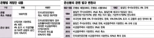 [아시아경제 이은정 기자] 인터넷전문은행의 운명을 가르는 은행법 개정안 논의가 18일 국회 정무위 법안심사소위원회에서 시작됐지만 험로가 예상된다. 은산 분리 완화를 핵심으로 한 은행법 개정을 통해 ICT(정보통신기술) 기업 같은 창의적인 잠재 사업자를 끌어들이겠다는 게 정부의 판단이다. 하지만 산업자본의 은행 장악을 우려하는 여론이 만만찮아 국회 논의 과정에서 격론이 불가피하다. ◆ 재벌의 사금고화 우려 최대 쟁점= 야당은 인터넷전문은행에 한해 은산분리를 완화하더라도 은행이 재벌의 사금고화될 수 있다는 점을 우려하고 있다. 투자 여력이 있는 상당수 ICT 기업들이 재벌로 불리는 대기업 집단에 속해 있다는 게 이같은 주장을 뒷받침하는 주요 근거다. 현재 3개 컨소시엄에 SK(SK텔레콤)와 포스코(포스코ICT), GS(GS홈쇼핑, GS리테일), 한화(한화생명) 등이 참여한 상태다.인터넷전문은행의 업무가 시중은행과 본질적으로 같기 때문에 대기업 참여로 인한 금융시스템의 불안정성을 야기할 수 있다는 점도 은산분리 완화의 반대 근거 중 하나다. 동양그룹 사태 때 동양증권이 동양 계열사의 기업어음과 회사채를 불완전 판매해 투자자에게 피해를 입힌 사례가 대표적인 사례다. 김기식 새정치민주연합 의원은 "현행법 테두리 내에서도 대기업의 인터넷전문은행 참여가 가능한데 은산분리를 완화하면 대기업의 참여는 더 확대될 수 밖에 없다"며 "은산분리 완화는 있을 수 없는 일로, 현행법 내에서 인터넷전문은행 사업이 추진되는 게 맞다"고 잘라 말했다. 이에 대해 정부는 "공정거래법상 상호출자제한기업집단에 대해 기존 4%룰이 그대로 유지되기 때문에 우려가 없다"고 반박한다. 이날 법안소위에 올라온 신동우 의원안에도 공정거래법상 상호출자제한기업(대기업) 집단은 예외로 두고 있다. 이윤수 금융위원회 과장은 "개정안도 기존처럼 대기업 집단의 지분 참여를 제한하고 있기 때문에 은산분리 완화에 따른 사금고화는 전혀 문제되지 않을 것"이라며 "기존 은행과는 유전자가 다른 집단이 들어와야 혁신적 사업이 가능한 만큼 개정안이 꼭 통과돼야 한다"고 강조했다. ◆은산분리 필요하지만 국회 심의 진통 불가피= 금융권 안팎에서도 인터넷전문은행의 성공적 안착을 위해서는 은산분리 완화가 필요하다는 의견이 나오고 있다. 소비자 편의성을 높이고 은행산업의 경쟁을 촉발하려면 ICT 기업 같은 산업자본의 참여가 필요하다는 시각에서다. 일본에서도 인터넷전문은행 사업을 앞두고 5%로 지분제한을 뒀던 은산분리 방침을 완화했다. 1950년 제정돼 1954년 시행된 은행법에는 은산분리나 동일인 주식 보유 한도에 대한 제한이 없었다. 정부가 은행을 소유하고 있었기 때문이다. 동일인에 대한 주식보유한도가 법에 등장한 것은 1982년 은행법 개정때다. 당시 시중은행 민영화로 우려되는 사금고화를 막기 위해 8%로 동일인 지분한도 규제를 정했다. 동일인이란 같은 1인으로 보는 범위를 정한 개념으로, 주식을 보유하려는 본인과 그 특수관계인까지 포함한다. 이어 1994년에는 동일인 지분한도가 4%로 축소됐고 2002년부터는 동일인 지분한도(10%)와 비금융주력자 지분한도(4%)가 함께 적용됐다. 현행 은행법상 비금융주력자는 전체 회사의 비금융회사 자본비중이 25% 이상이거나 비금융회사의 자산합계가 2조원 이상인 경우를 말한다. 2009년 개정 때는 비금융주력자 지분한도가 4%에서 9%로 완화됐다가 4년 후인 2013년(현행법)에 다시 4%로 축소됐다. 금융업계 고위관계자는 "인터넷전문은행에 한해 산업자본에 대한 지분규제를 완화하겠다는 것이지만 은행법의 근간을 이뤄온 은산분리 원칙을 손대는 것은 간단하지 않다"며 "인터넷전문은행 사업에 은산분리 완화를 적용하기 힘들다면 미국처럼 저축은행 기준을 적용하는 것도 고려해봐야 한다"고 조언했다. 미국도 은행지주회사법에는 산업자본이 직간접적으로 25% 이상 의결권을 행사할 수 없도록 제한하고 있다. 이에 따라 미국의 인터넷전문은행은 규제가 거의 없는 저축은행으로 인가를 받아 영업을 하고 있다. 우리나라 저축은행도 은행과 달리 대기업의 지분 보유 제한이 없다.이은정 기자 mybang21@asiae.co.kr<ⓒ세계를 보는 창 경제를 보는 눈, 아시아경제(www.asiae.co.kr) 무단전재 배포금지>