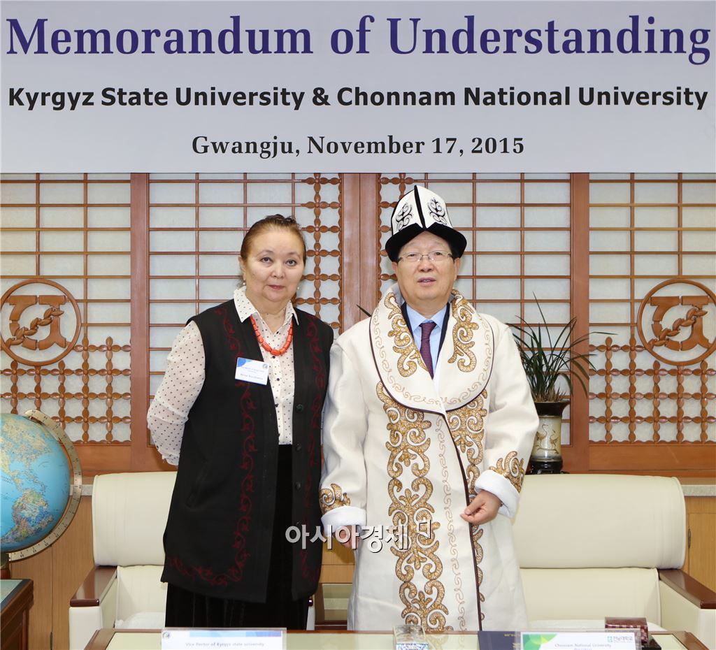 전남대학교 지병문 총장이 17일 대학본부에서 선물로 받은 키르키즈스탄 전통의상을 입은 채 아니사 보루바에바 키르키즈 국립대 부총장과 기념촬영을 하고 있다,