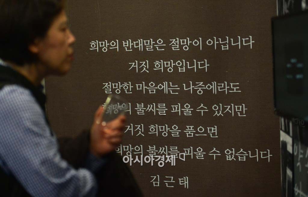 [아시아경제 백소아 기자] 18일 서울 중구 시민청에서 열린 김근태 4주기 추모전-포스트 트라우마 전시회 한 켠에 故김근태 전 장관이 생전 했던 이야기가 전시되어 있다.백소아 기자 sharp2046@asiae.co.kr<ⓒ세계를 보는 창 경제를 보는 눈, 아시아경제(www.asiae.co.kr) 무단전재 배포금지>