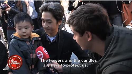 프랑스 파리 바타클랑 극장을 찾은 앤젤 레와 그의 아들 브랜든(5)이 '꽃과 촛불'의 의미에 대해 인터뷰하고 있다.