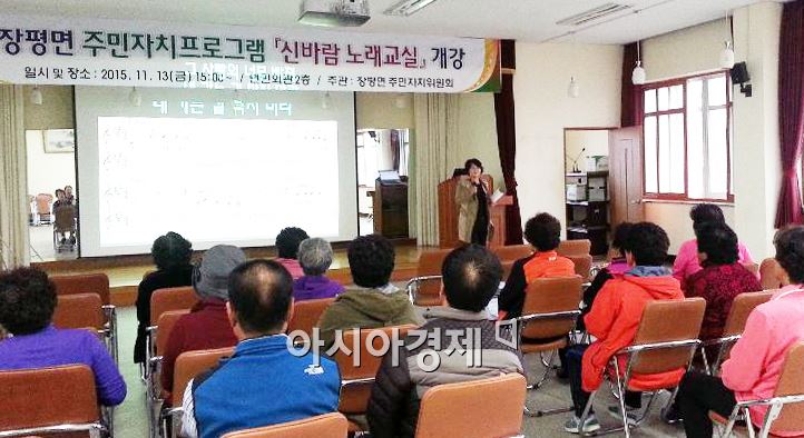 "농한기 맞은 지역 주민 위해 한 달 간 신바람노래교실 운영" [아시아경제 노해섭 ]농번기를 마친 지역주민들을 위해 장흥군 장평면에서 주민자치센터 프로그램으로 ‘신바람 노래교실’을 마련해 주민들의 호응을 받고 있다. 장평면 주민자치위원회는 지난 13일 장평면민회관에서 지역주민 40명이 참여한 가운데 ‘신바람 노래교실’ 개강식을 개최했다. 이번 노래교실은 평소 여가활동이 어려운 지역 어르신과 추수를 마치고 농한기에 접어든 주민들의 생활에 활기를 불어넣고자 마련됐다. 서미숙 노래강사의 지도로 지난 13일부터 시작된 노래교실은 매주 수요일과 금요일 2시간씩 진행되며 오는 12월 11일까지 운영된다. 김이문 장평면장은 “이번 노래교실이 지역주민들의 생활에 활력소가 되고 마음껏 소리 질러 농번기로 쌓인 스트레스를 날려버렸으면 한다”며 “앞으로도 지역민의 소통과 화합의 장인 주민자치센터의 활성화를 위해 노력하겠다”고 전했다. 한편, 장평면 주민자치위원회는 주민들이 이용할 수 있는 건강증진시설과 작은 도서관 등을 운영하고 있어 주민들에게 좋은 반응을 얻고 있다.노해섭 기자 nogary@<ⓒ세계를 보는 창 경제를 보는 눈, 아시아경제(www.asiae.co.kr) 무단전재 배포금지>