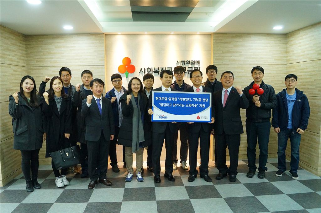 ▲19일 서울 중구 사랑의 열매회관에서 열린 성금 전달식 행사에서 김주현 사회복지공동모금회 사무총장(사진 오른쪽 네번째)와 노진석 현대로템 경영지원본부장(사진 왼쪽 다섯번째)이 기념촬영을 하고 있다.<br />