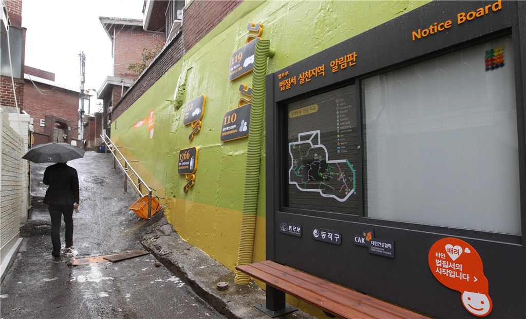 이 가운데 85% 이상이 사업 대상지에 집중돼 있다. 이곳의 여성 및 65세 이상 노인 거주 비율도 서울시와 구의 평균을 웃돈다. 최근 3년 간 대상지의 범죄 발생률은 증가했다. 특히 절도와 같은 생계형 범죄의 경우 2012년에 비해 2014년에는 13% 늘었다. 언어와 문화의 차이로 인한 무단투기 등 기초질서 위반 사례도 증가 추세다.◆소통문제 ⇒ 마을 곳곳 마을지도, 생활에티켓 그림문자, 소통 게시판 설치 이 사업은 이같은 지역적 특성을 고려해 범죄와 기초생활질서 위반의 우려가 높은 구간을 중심으로 추진됐다. 지난 6월 법무부 전문컨설팅단 현장확인을 통해 설계방향을 도출, 7월과 8월 차례로 주민 설명회를 가졌다.먼저 외국인이 많은 지역 특성을 반영해 주민들과 소통에 중점을 뒀다. CCTV 설치장소 등이 표기돼 있는 마을지도(3곳), 생활정보를 안내하는 미디어보드(1곳), 주민소통게시판(1곳)을 설치했다. 중국어와 한글로 병기한 무단투기금지 등 안내판(15곳)과 각종 생활에티켓을 알기 쉽게 표현한 그림문자(5곳)도 곳곳에 부착했다. 또 생계형 범죄 및 기초질서위반을 예방하기 위해 골목과 입구에 ‘문단속 주의 표지판’(15곳)을 만들고, 방범용 CCTV 5대와 말하는 CCTV 2대도 설치했다. 특히 문창초등학교 통학로 주변에는 KT링커스 협조를 받아 ‘안전부스’를 설치했다. 안전부스는 신변의 위협을 받은 주민이 들어가서 버튼을 누르면 문이 닫히는 공간이다. 또 현재의 위치를 파악하기 쉽도록 동작경찰서 협조를 받아 위치번호가 표기된 관리구역표지판(9곳)도 설치했다.이와 함께 밝고 생기 있는 환경을 위해 곳곳의 벽면을 밝게 도색(10곳), 좁고 가파른 계단(2곳)에도 눈에 띄는 색을 입혔다. 또 커뮤니티 공간은 물론, 자연적 감시도 이루어지도록 쉼터 3곳을 만들고, 운동기구도 설치했다.생활에티켓 표현한 그림문자