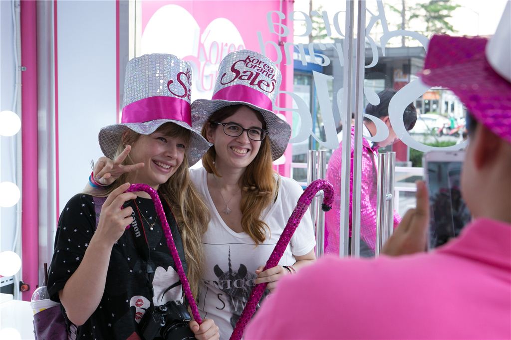 외국인들이 코리아그랜드세일 이벤트행사에 참여하며 즐거워하고 있다