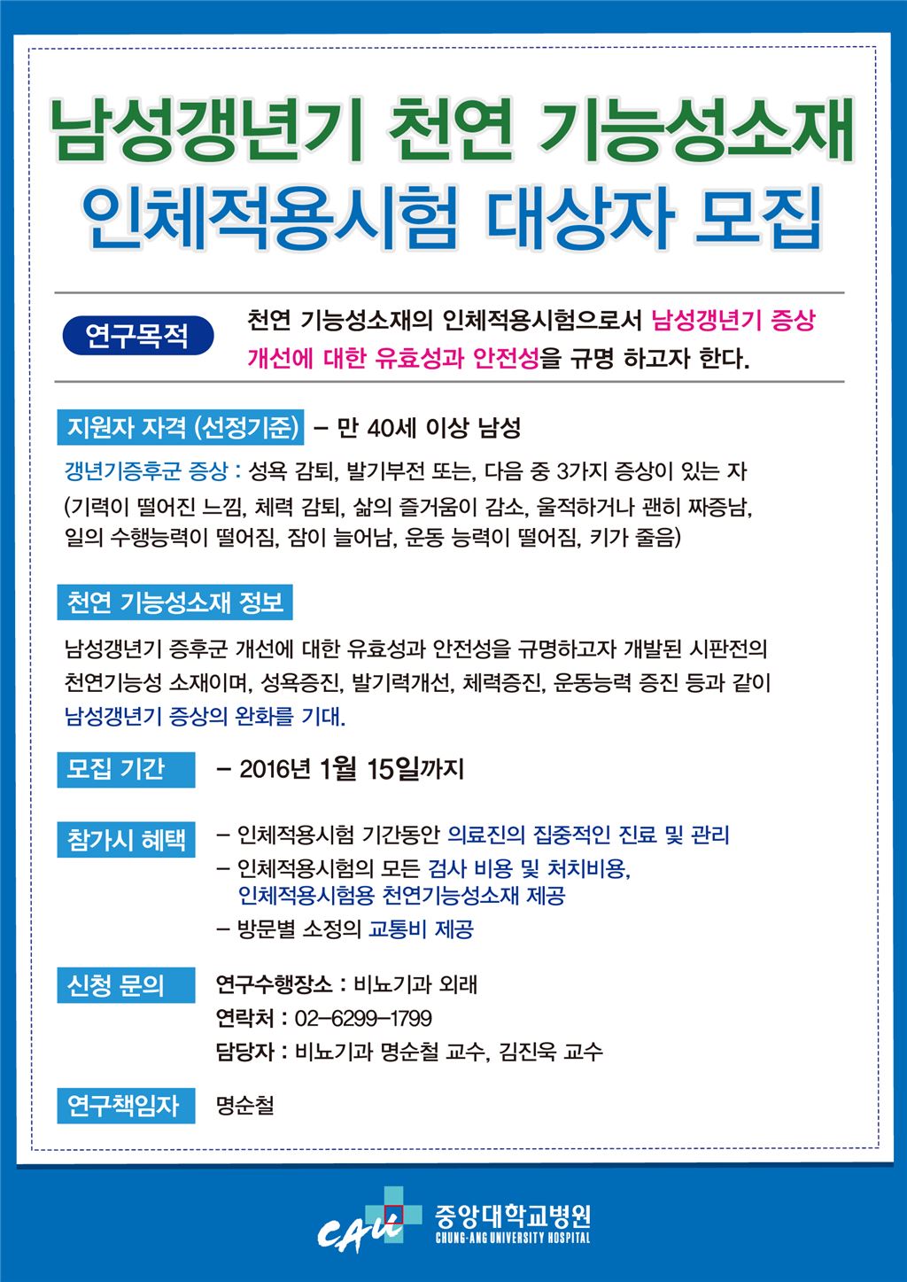 [아시아경제 권용민 기자] 중앙대학교병원 비뇨기과에서 남성갱년기 관련 임상시험에 참여할 대상자를 모집한다. 이번 임상시험은 천연 기능성소재의 남성갱년기 증상에 대한 개선에 대한 유효성과 안전성을 규명 하고자 하는 목적으로, 지원 대상은 만 40세 이상 남성으로 성욕감퇴, 발기부전 또는 체력감퇴 등의 갱년기증후근 증상이 있는 사람은 지원 가능하다. 모집기간은 2016년 1월 15일까지이며, 임상시험 참가자에게는 의료진의 집중적인 진료 및 관리와 검사?처치 비용, 인체적용시험용 천연 기능성소재가 무료로 제공되며 소정의 교통비도 함께 지급된다. 이번 임상시험에 대한 지원 및 자세한 문의는 중앙대학교병원 비뇨기과 임상연구실 02-6299-1799로 하면 된다.권용민 기자 festym@asiae.co.kr<ⓒ세계를 보는 창 경제를 보는 눈, 아시아경제(www.asiae.co.kr) 무단전재 배포금지>