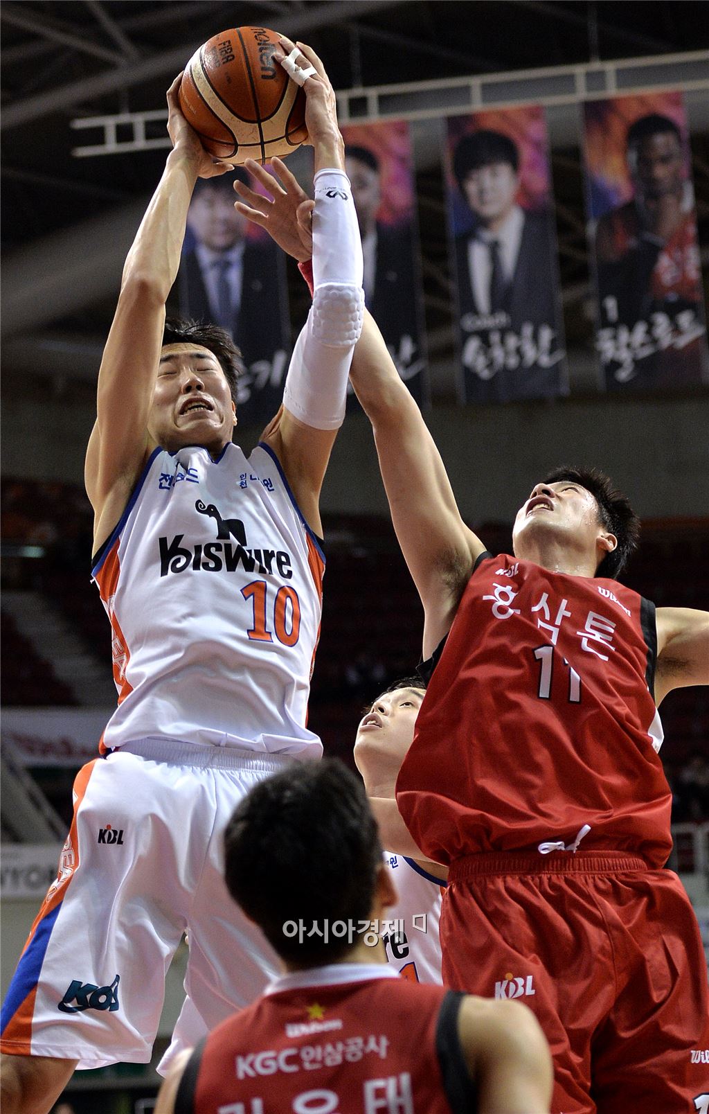 [안양=아시아경제 김현민 기자] 2015-2016 프로농구 안양 KGC인삼공사와 인천 전자랜드의 경기가 20일 안양실내체육관에서 열렸다. 전자랜드 정효근이 상대 양희종과 리바운드를 다투고 있다. 김현민 기자 kimhyun81@asiae.co.kr<ⓒ세계를 보는 창 경제를 보는 눈, 아시아경제(www.asiae.co.kr) 무단전재 배포금지>