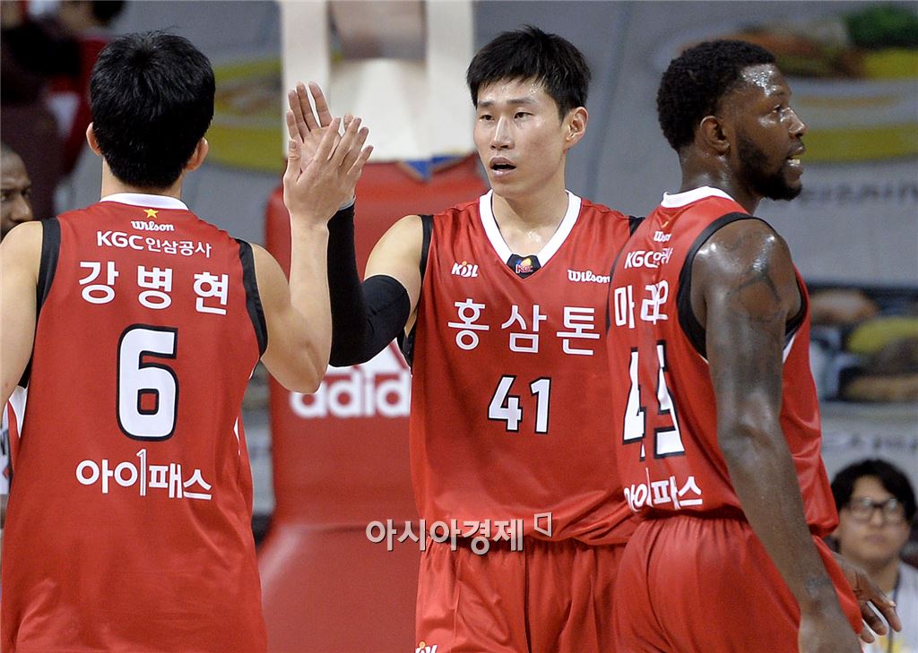 [안양=아시아경제 김현민 기자] 2015-2016 프로농구 안양 KGC인삼공사와 인천 전자랜드의 경기가 20일 안양실내체육관에서 열렸다. KGC 오세근이 득점한 뒤 동료들과 하이파이브하고 있다. 김현민 기자 kimhyun81@asiae.co.kr<ⓒ세계를 보는 창 경제를 보는 눈, 아시아경제(www.asiae.co.kr) 무단전재 배포금지>