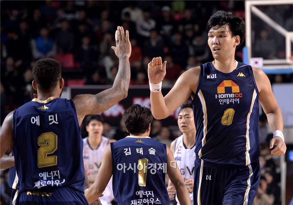 [전주=아시아경제 김현민 기자] 2015-2016 프로농구 전주 KCC와 창원 LG의 경기가 22일 전주실내체육관에서 열렸다. KCC 하승진이 득점한 뒤 에밋과 하이파이브하고 있다. 김현민 기자 kimhyun81@asiae.co.kr<ⓒ세계를 보는 창 경제를 보는 눈, 아시아경제(www.asiae.co.kr) 무단전재 배포금지>