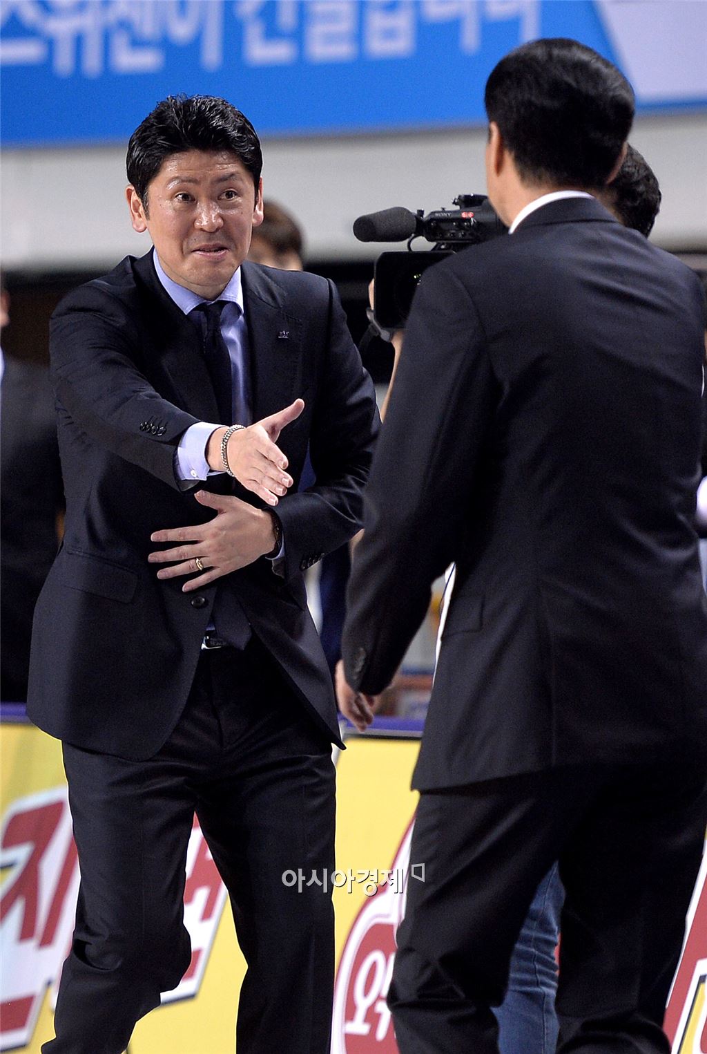 [전주=아시아경제 김현민 기자] 2015-2016 프로농구 전주 KCC와 창원 LG의 경기가 22일 전주실내체육관에서 열렸다. KCC 추승균 감독이 83-73으로 이긴 뒤 LG 김진 감독과 인사하고 있다. 김현민 기자 kimhyun81@asiae.co.kr<ⓒ세계를 보는 창 경제를 보는 눈, 아시아경제(www.asiae.co.kr) 무단전재 배포금지>