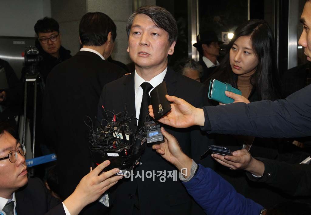 [사진공동취재단] 김영삼 전 대통령이 서거한 22일 오후 서울 종로구 서울대병원 장례식장에 마련된 김 전 대통령 빈소에서 안철수 의원이 기자들의 질문에 답하고 있다.<ⓒ세계를 보는 창 경제를 보는 눈, 아시아경제(www.asiae.co.kr) 무단전재 배포금지>