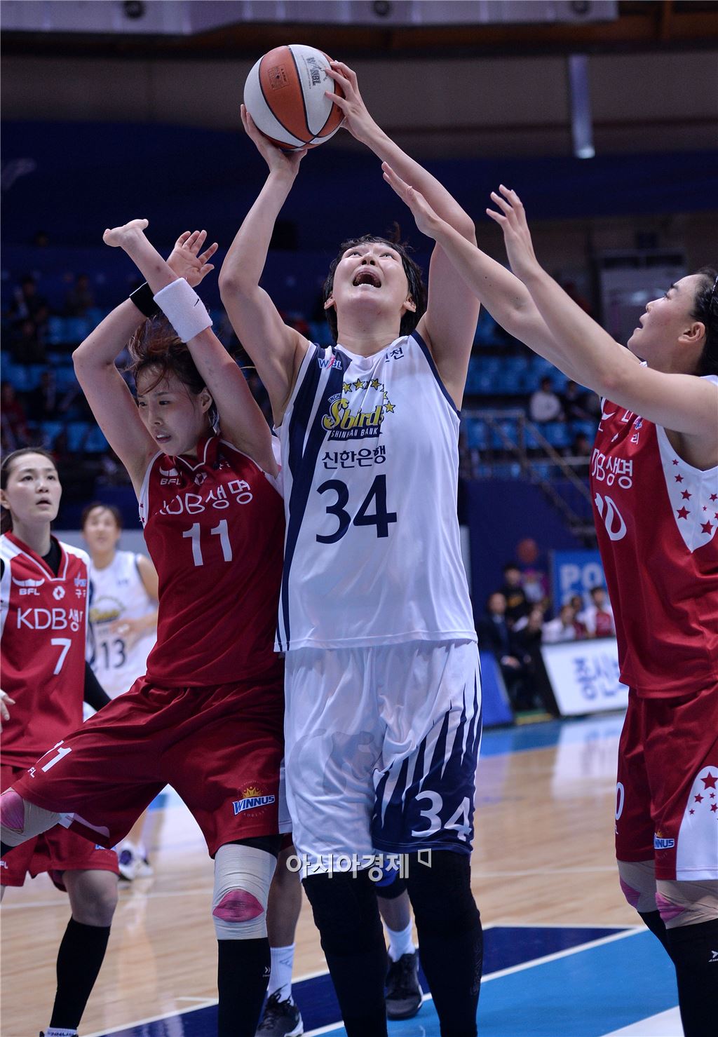 [인천=아시아경제 김현민 기자] '2015-2016 KDB생명 여자프로농구' 신한은행과 KDB생명의 경기가 23일 인천 도원체육관에서 열렸다. 신한은행 하은주가 상대 최원선의 수비를 뚫고 슛하고 있다. 김현민 기자 kimhyun81@asiae.co.kr<ⓒ세계를 보는 창 경제를 보는 눈, 아시아경제(www.asiae.co.kr) 무단전재 배포금지>