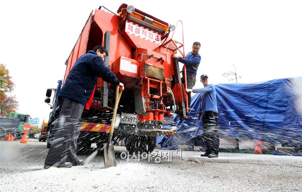 광주 북구가 겨울철 안전대책 마련에 들어간 가운데 24일 광주 북구청 건설과 도로팀 직원들이 제설자재보관소 앞에서 겨울철 폭설을 대비해 제설차량 살포기 시험가동과 제설장비 점검을 하고 있다.