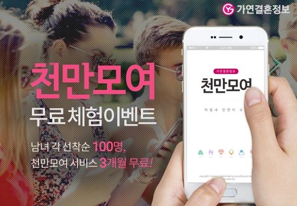 [아시아경제 최서연 기자] 결혼정보회사 가연은 모바일결혼정보서비스 ‘천만모여’를 무료로 이용할 200인의 체험단을 모집한다고 24일 밝혔다.모집인원은 남녀 각 선착순 100명씩으로 총 200명이다. 선정된 이들은 연간 99만원 상당의 모바일결혼정보서비스를 3개월간 무료로 이용할 수 있다.체험단으로 활동하는 이들은 3개월간 ‘내 이상형 조건에 맞는 회원’, ‘천만모여 시스템이 판단한 회원’, ‘상대방의 이상형 조건에 맞는 회원’을 최대 92명까지 추천 받을 수 있다. 또한 이성에게 내 프로필이 추천되는 것까지 고려하면 연결의 기회는 더욱 많은 셈이다.신청은 천만모여 이벤트 페이지(//me2.do/xsxiQFbJ)에서 이름과 휴대폰번호를 통한 간단한 인증절차만으로 가능하다. SMS를 통해 전송 받은 쿠폰 번호를 천만모여 애플리케이션(이하 앱) 결제 페이지에서 입력하면 3개월간 무료 이용이 가능하다.천만모여는 결혼정보회사 가연에서 결혼정보업계 최초로 선보인 모바일 앱 형태의 결혼정보서비스로, 결혼정보서비스로, 3가지 절차의 신원인증을 거친 회원만이 이용 가능한 프리 매칭 서비스다.결혼정보회사에서 이뤄지는 철저한 신원인증 방식을 통해 결혼여부는 물론 신용정보, 학력, 직업 등 확실하게 검증된 프로필만을 제공하는 것이 특징이다.특히 매칭 건별로 추가 결제가 이뤄지는 일반적인 소개팅 앱과는 달리, 천만모여는 연 회원 방식으로 철저하게 회원제로 운영되고 있다. 이밖에도 소셜데이팅 서비스의 단점을 보완하고자 모든 회원에게 가상의 휴대폰번호인 안심번호를 부여해 개인정보 보호에까지 앞장서고 있다.최서연 기자 christine89@asiae.co.kr<ⓒ세계를 보는 창 경제를 보는 눈, 아시아경제(www.asiae.co.kr) 무단전재 배포금지>
