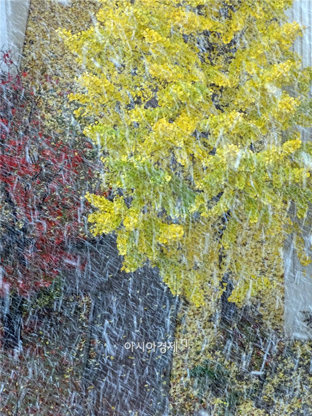 광주와 전남 일부지역에 대설예비특보가 발효된 26일 오전 광주 서구 쌍촌동 지역에 첫 눈이 내리고 있다. 노랗게 물든 은행나무에 몰아치는 첫눈이 마치 수채화를 연상케 한다. 광주지역 예상 적설량은 1~5㎝이며 전남 영광, 함평, 장성, 담양지역은 3~8㎝ 정도 눈이 내릴 것으로 보인다.