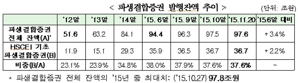 [아시아경제 임철영 기자]주가연계증권(ELS) 등 파생결합증권 발행잔액 증가속도가 하반기들어 둔화되고 있는 것으로 나타났다. 쏠림이 심했던 홍콩 항셍중국기업지수(HSCEI)에 기초한 파생결합증권 발행비중도 하반기 37~38% 수준에 머물고 있다.26일 금융당국에 따르면 파생결합증권 발행잔액은 2012년말 51조6000억원에서 올해 상반기 94조4000억원으로 가파르게 늘었으나 지난달 27일 97조8000억원으로 최대치를 기록한 이후 감소하기 시작했다. 11월 현재 파생결합증권 발행잔액은 97조6000억원으로 집계됐다. 홍콩 항셍중국기업지수(HSCEI) 기초 파생결합증권 발행잔액도 2012년말 11조9000억원에서 올해 6월말 35조9000억원으로 2배 이상 급증한 이후 최근 몇 달 36조원 중반에 머물러 있다. 발행잔액 비중은 2012년말 23%에서 2015년 6월말 38%로 정점을 찍은 이후 현재 37% 중반 수준을 유지하고 있다. 금융위원회 관계자는 "쏠림이 심한 HSCEI지수 기초 파생결합증권은 금융투자회사 자율합의에 따라 관리가능한 범위에서 발행 중"이라며 "HSCEI지수 기초 파생결합증권 잔액은 9월말 수준을 유지하고 있으며, ‘16년 이후에는 잔액이 감소할 것으로 예상한다"고 설명했다. 금융당국은 지난 9월 유동성 스트레스 테스트를 실시하고 증권사의 건전성과 유동성 등 위험요인이 관리 가능한 수준이라고 판단했다. 증권사 NCR은 지난 6월말 기준으로 466%, 유동성비율은 138% 수준이다. 금융위 관계자는 "증권사 유동성 스트레스 테스트를 실시한 결과 상당한 수준의 스트레스 상황에서도 시스템 리스크가 발생할 가능성은 미미하다고 본다"며 "파생결합증권 쏠림현상과 증권사의 위험요인 등에 대해서는 금감원 등을 통해 지속적으로 모니터링 해 나갈 계획"이라고 말했다.금융당국은 증권사 건전성 스트레스 테스트도 연내에 실시할 방침이다. 또한 다음달 금융투자업규정을 개정, 파생결합증권 조달자금 별도계정 마련 등 제도개선도 추진할 계획이다. 임철영 기자 cylim@asiae.co.kr<ⓒ세계를 보는 창 경제를 보는 눈, 아시아경제(www.asiae.co.kr) 무단전재 배포금지>