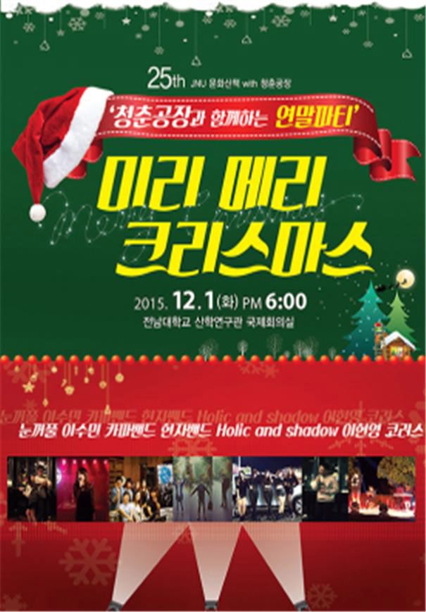 [아시아경제 노해섭 기자]전남대학교(총장 지병문) JNU문화산책 25번째 공연이 12월 1일 오후 6시 전남대학교 여수캠퍼스 산학연구관 국제회의실에서 개최된다.이번 공연은 ‘미리 메리 크리스마스’를 주제로 교내 구성원과 외부 공연팀이 함께 출연해 노래 및 댄스 공연을 펼친다.특히 이번 공연에는 카파밴드, 현자밴드, 홀릭&쉐도우, 코러스 등 여수 지역에서 활동중인 인디밴드와 댄스팀, 음악 동아리가 출연해 저물어가는 한 해의 아쉬움을 달래는 흥겨운 음악 한마당을 펼칠 예정이다.전남대학교는 JNU문화산책 프로그램을 통해 구성원들의 문화체험 및 지역주민과 구성원간의 소통의 기회를 제공하고 있다.노해섭 기자 nogary@<ⓒ세계를 보는 창 경제를 보는 눈, 아시아경제(www.asiae.co.kr) 무단전재 배포금지>