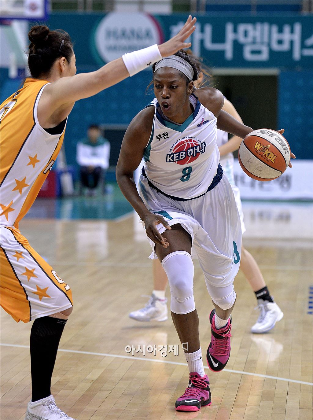 [부천=아시아경제 김현민 기자] '2015-2016 KDB생명 여자프로농구' KEB 하나은행과 KB 국민은행의 경기가 27일 부천실내체육관에서 열렸다. 하나은행 모스비가 상대 수비를 뚫고 공격하고 있다. 김현민 기자 kimhyun81@asiae.co.kr<ⓒ세계를 보는 창 경제를 보는 눈, 아시아경제(www.asiae.co.kr) 무단전재 배포금지>